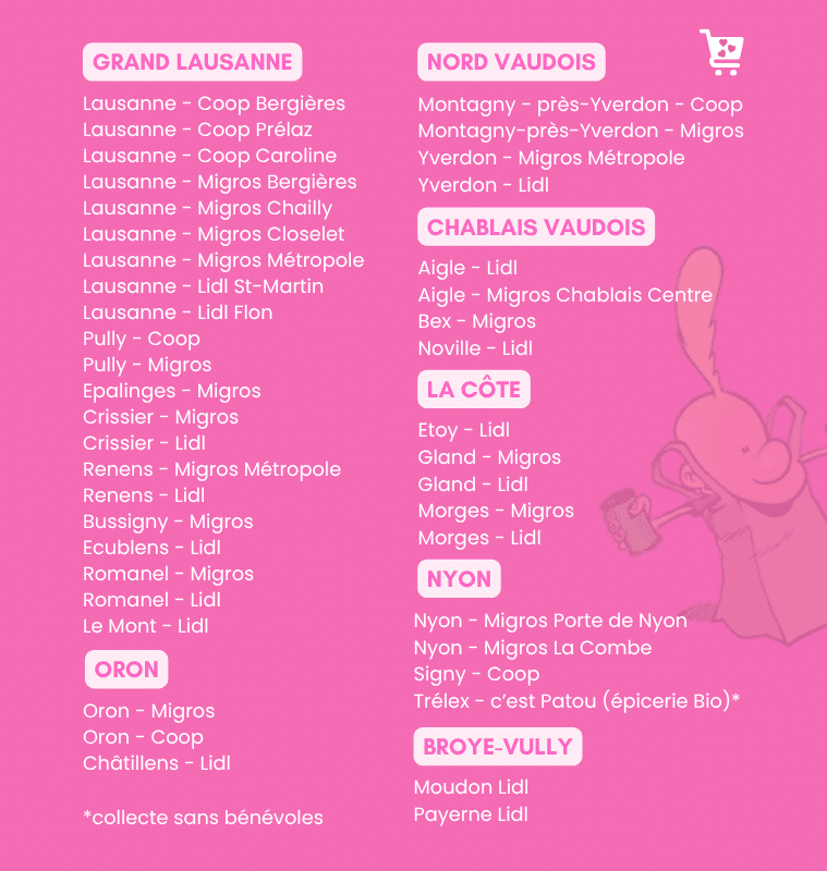- Faites don de produits! Rendez-vous les 08 et 09 mai 2026 dans une de nos enseignes partenaires où vous pourrez remplir un cabas rose de produits de première nécessité et nous le confier